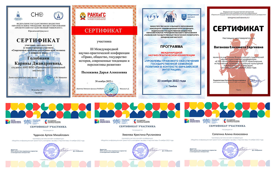 Первая половина 2022-23 учебного года для студентов юридического факультета была насыщена участием в различных научных мероприятиях с результатами своих исследований, итогом чего стали дипломы, сертификаты, публикации.