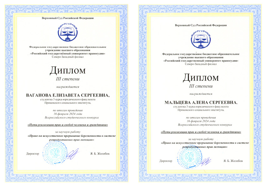Студентки 3 курса юридического факультета Прикамского социального института Елизавета Ваганова и Алена Мальцева стали призерами Всероссийского студенческого конкурса научных работ по правам человека.