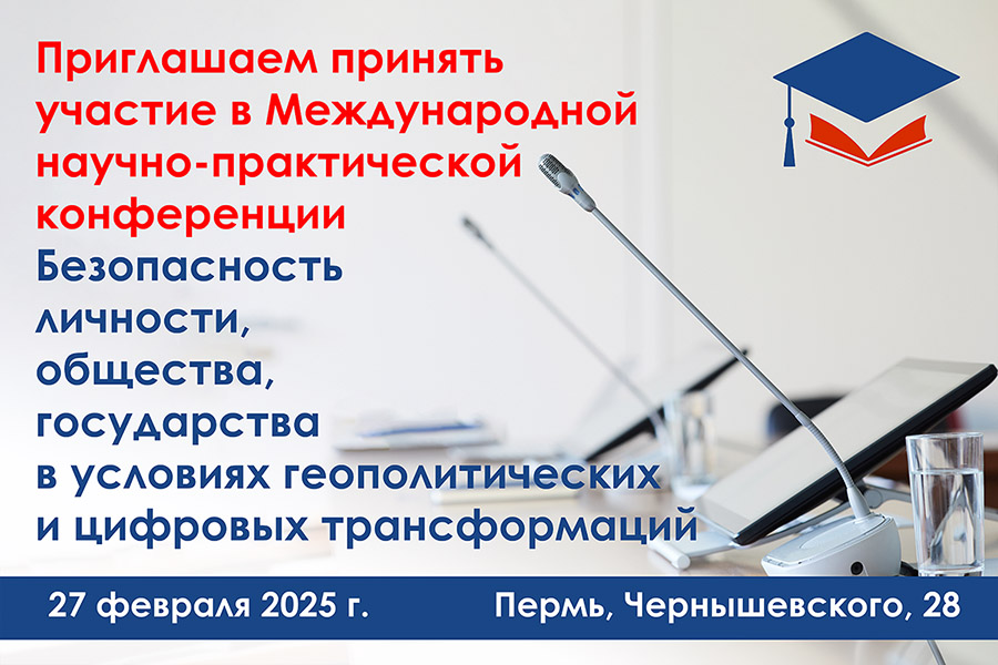 Приглашаем вас принять участие в Международной научно-практической конференции «Безопасность личности, общества, государства в условиях геополитических и цифровых трансформаций», которая состоится 27 февраля 2025 года в Прикамском социальном интитуте.